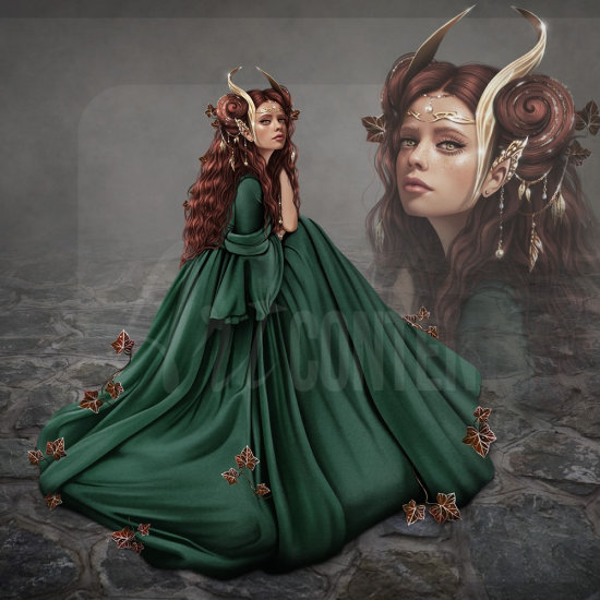 composition variations (human and elf ears, crown, golden tiaras, ivy, various hair accessories, on the forehead, wrists, ear)